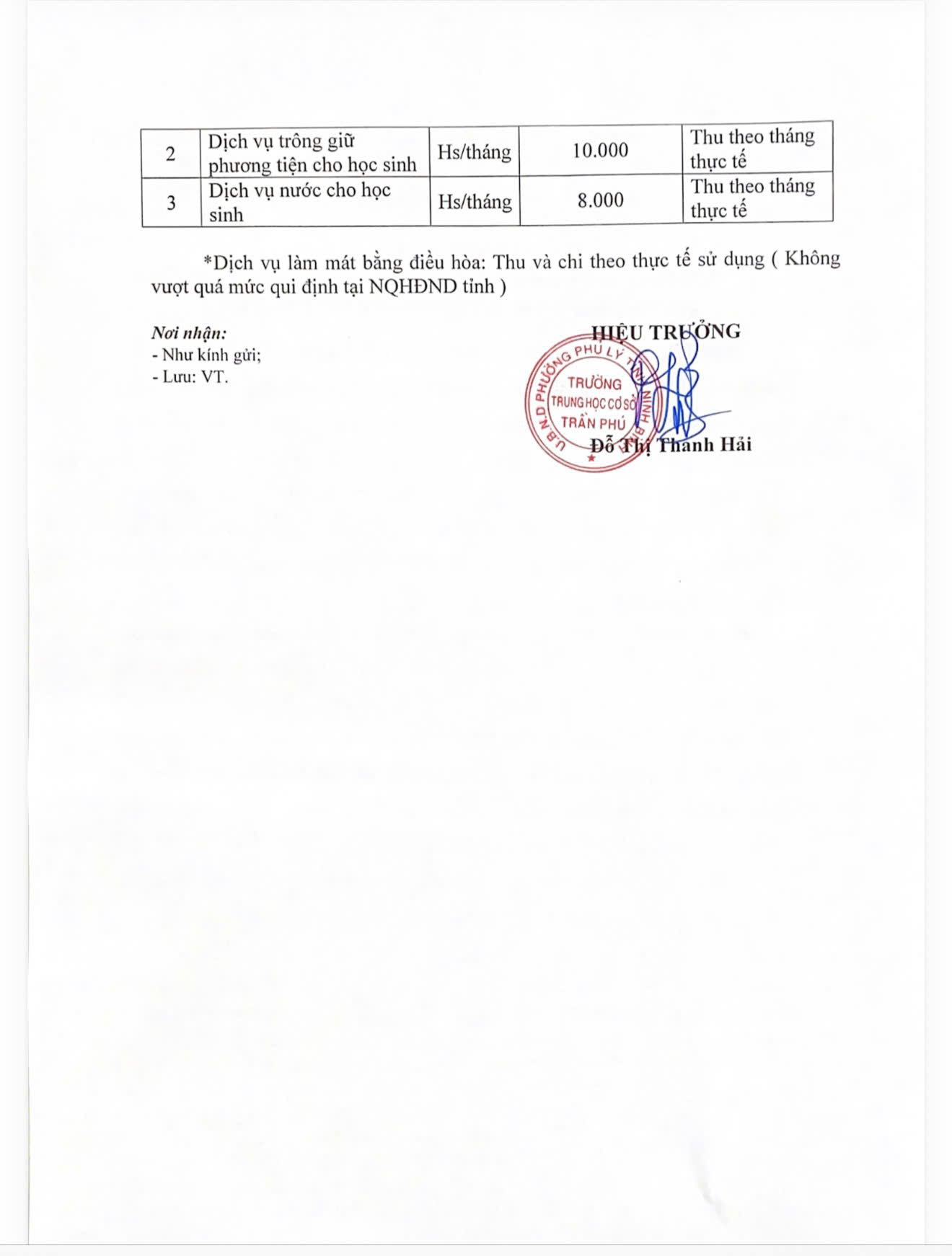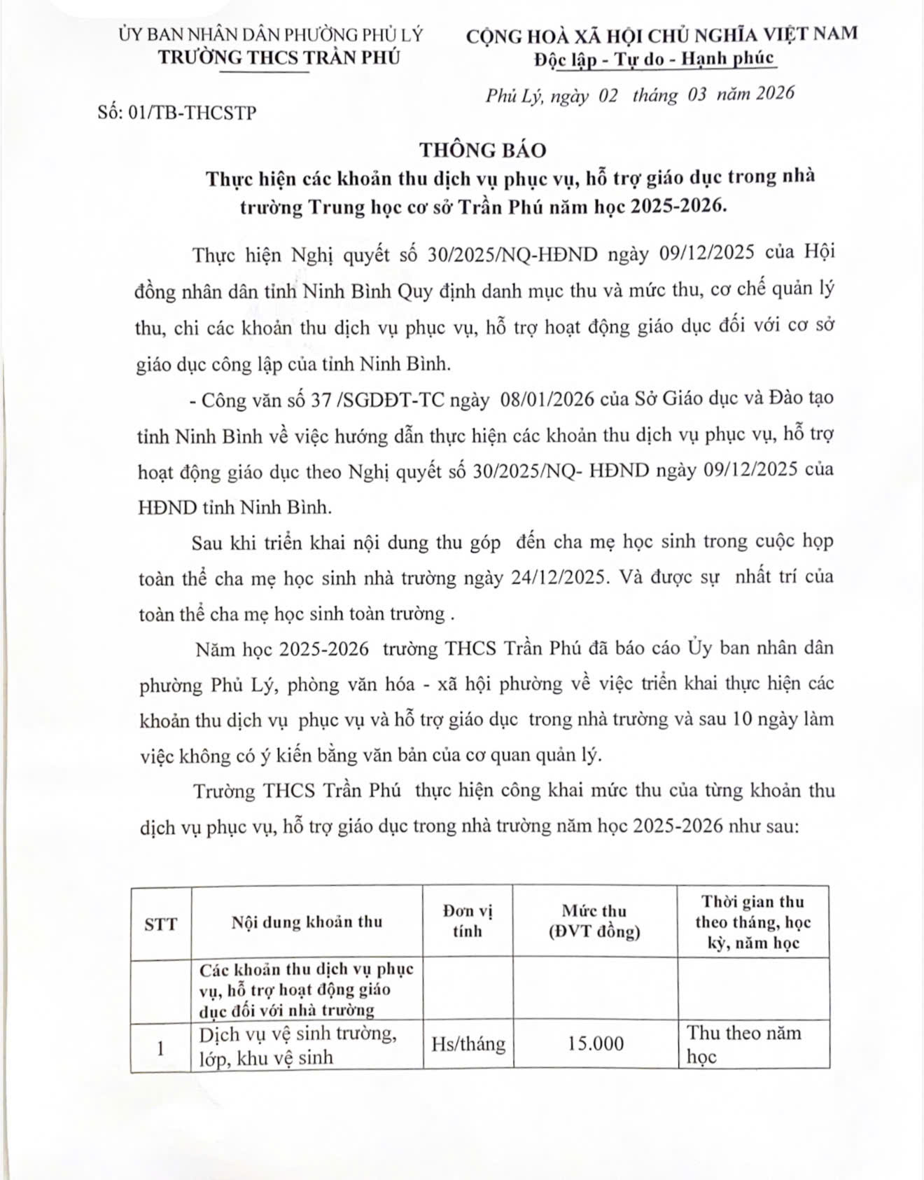 Thông báo thực hiện các khoản thu dịch vụ phục vụ, hỗ trợ giáo dục trong nhà trường THCS Trần Phú năm học 2025-2026